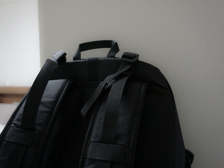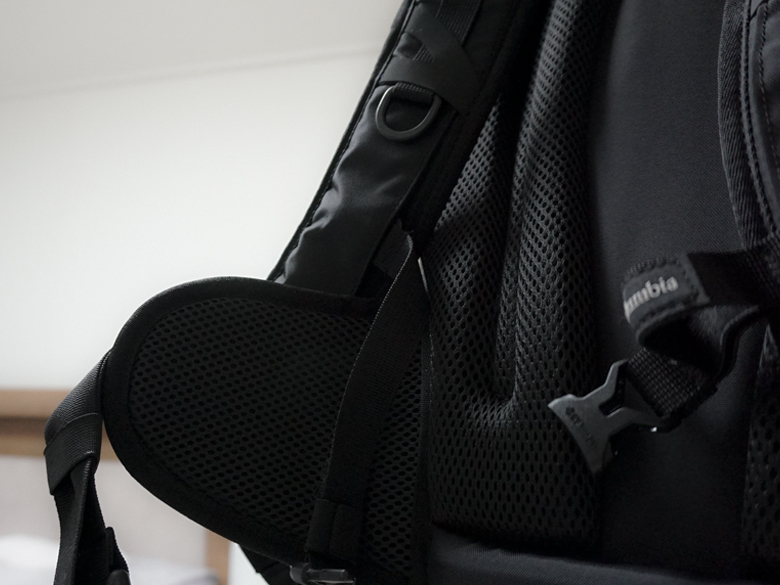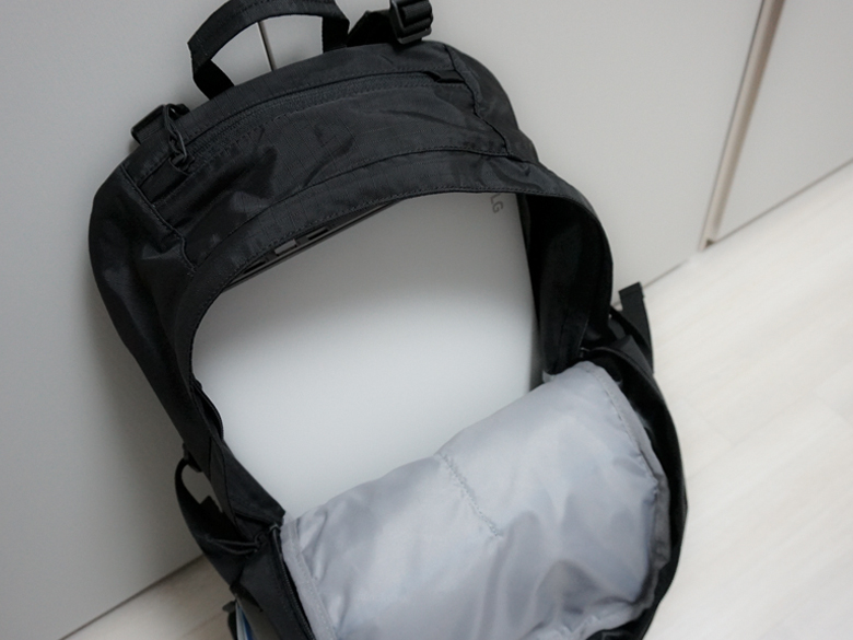오로지 등산의 목적을 가진 백팩과 비교하기는 그렇지만 산행할 때 필요한 장비를 가방에 체결하거나 수납할 수 있다. 등산 스틱도 가방에 홀딩 시킬 수 있다.