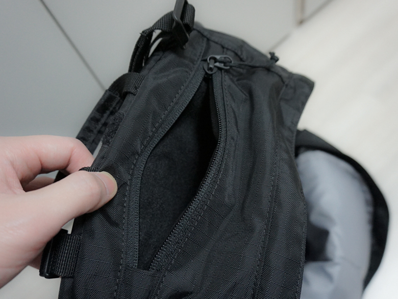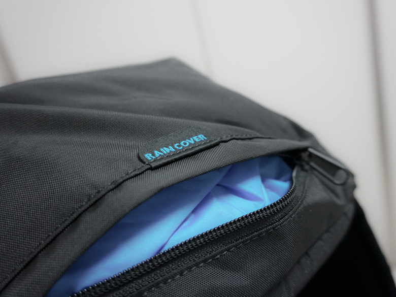 제품의 하단에는 레인커버가 내장되어 있는데 레인커버가 빠지지는 않는다. 이 가방을 메고 두 번째 산행할 때 비가 내려서 레인커버를 바로 사용해보았는데 간편하고 빠르게 가방을 감쌀 수 있어서 좋았던 것 같다.