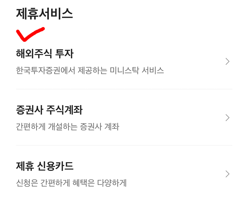 그러면 상품/서비스 카테고리를 볼 수 있는데, 빨간색으로 표시된 제휴를 선택합니다. 제휴를 선택하면 여러 가지 제휴 서비스 목록을 확인할 수 있습니다. 빨간색으로 표시한 해외주식 투자를 선택합니다.