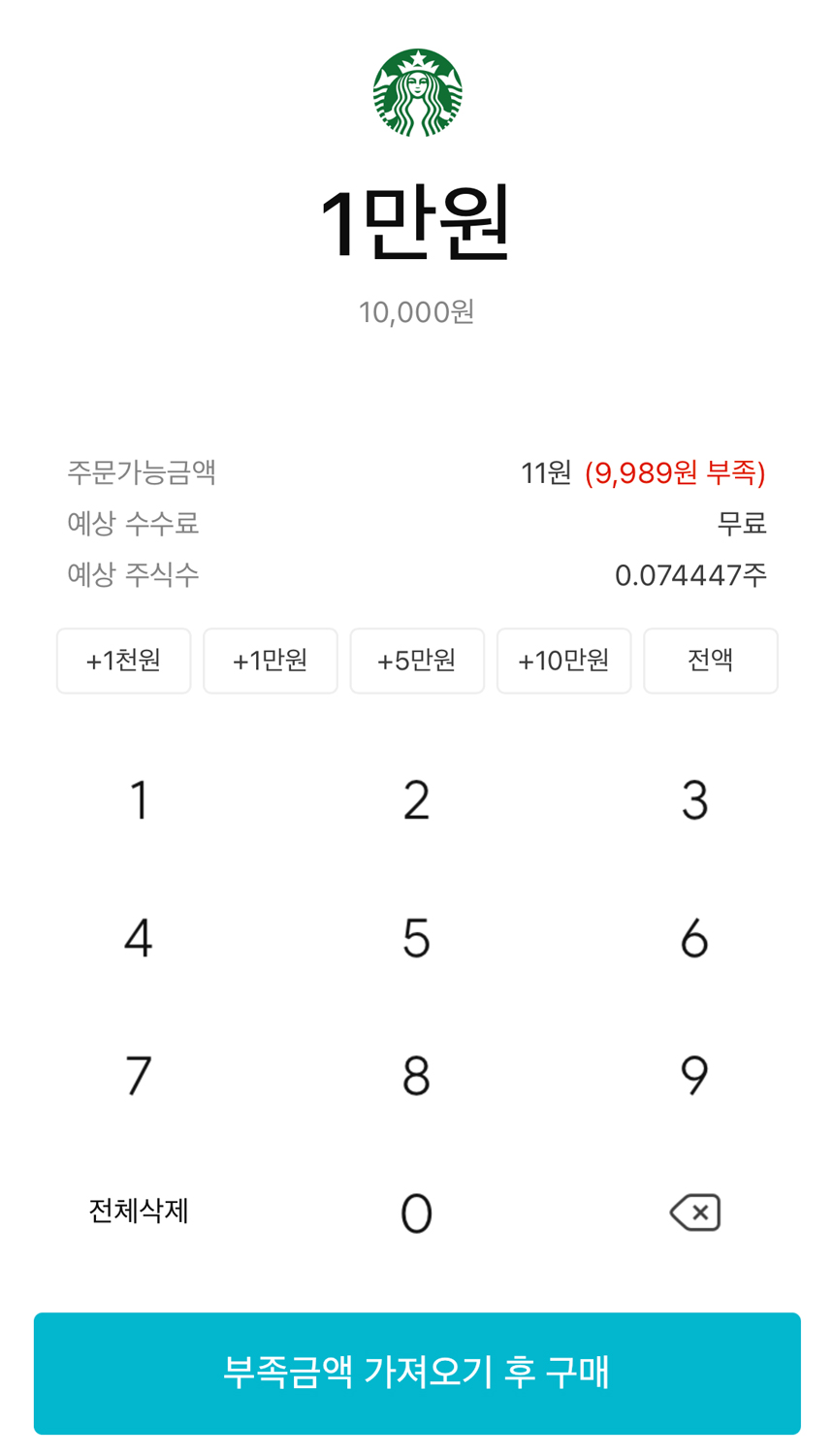 종목 정보 화면에서 화면을 위아래로 움직이면 시가총액, PER, ROE 등 기본정보가 나오고 간략한 기업정보를 확인할 수 있습니다. 스타벅스 주식을 1만 원 치 구매하겠습니다. 하단에 구매하기 버튼을 누릅니다.