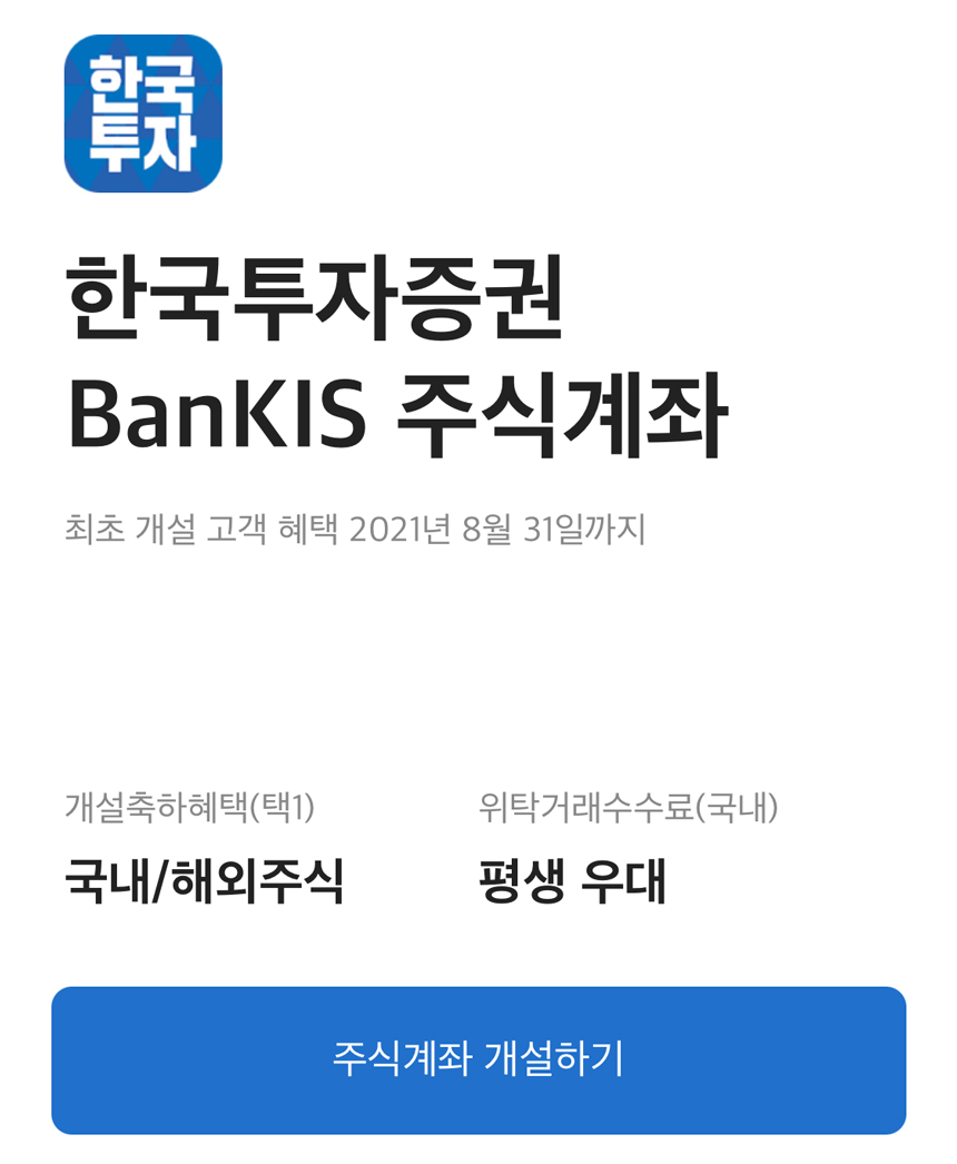 우측 하단 노란색 가입하기 버튼을 눌러줍니다. 그러면 한국투자증권 뱅키스 주식계좌 개설하기 화면으로 전환이 되는데, 개설하기 버튼을 눌러줍니다.