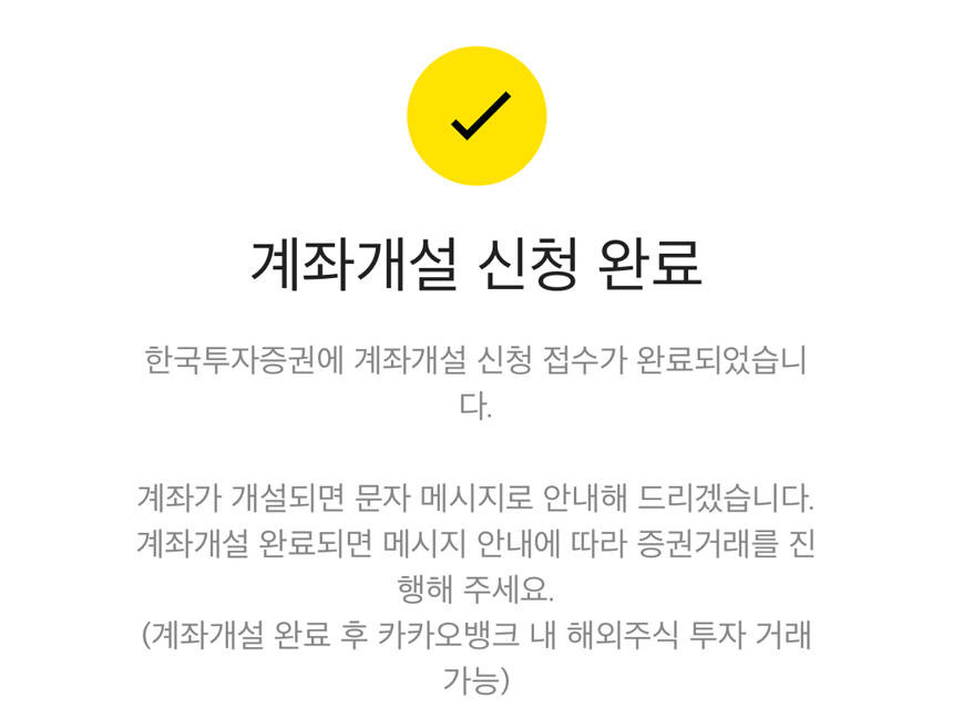 이렇게 짧은 단계를 통해 계좌 개설을 마쳤습니다. 주식을 매수할 때 한국투자증권 앱이 아닌 카카오 뱅크에서 매수를 진행할 수 있습니다. 카카오뱅크로 미국 주식을 매수하는 방법은 바로 아래에서 이어집니다.