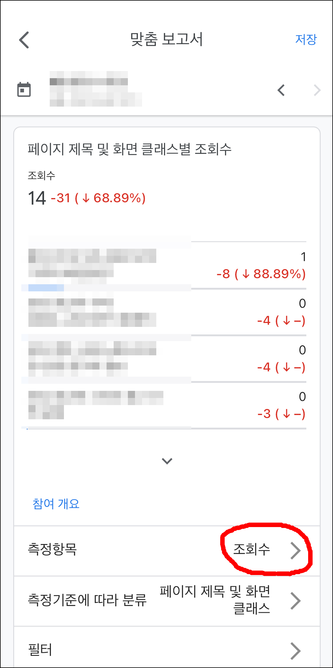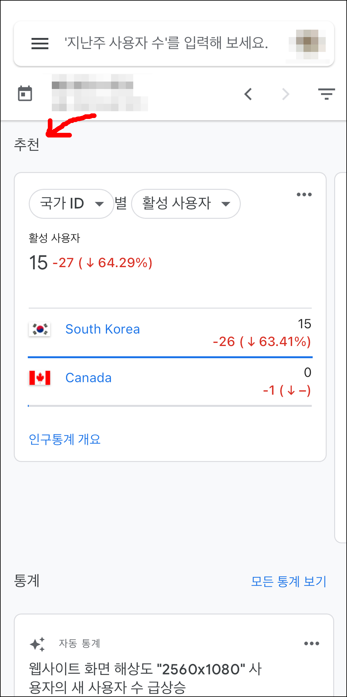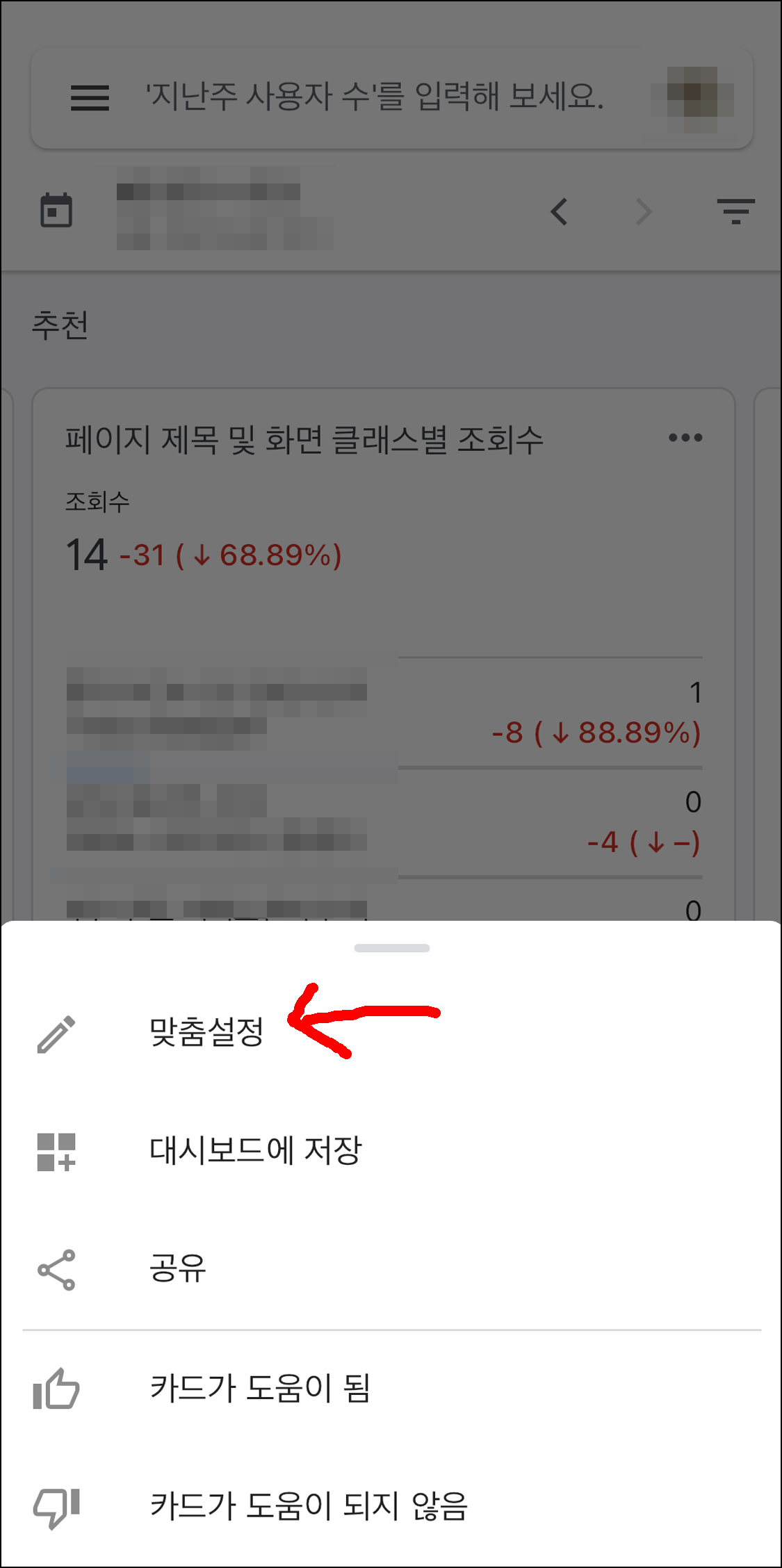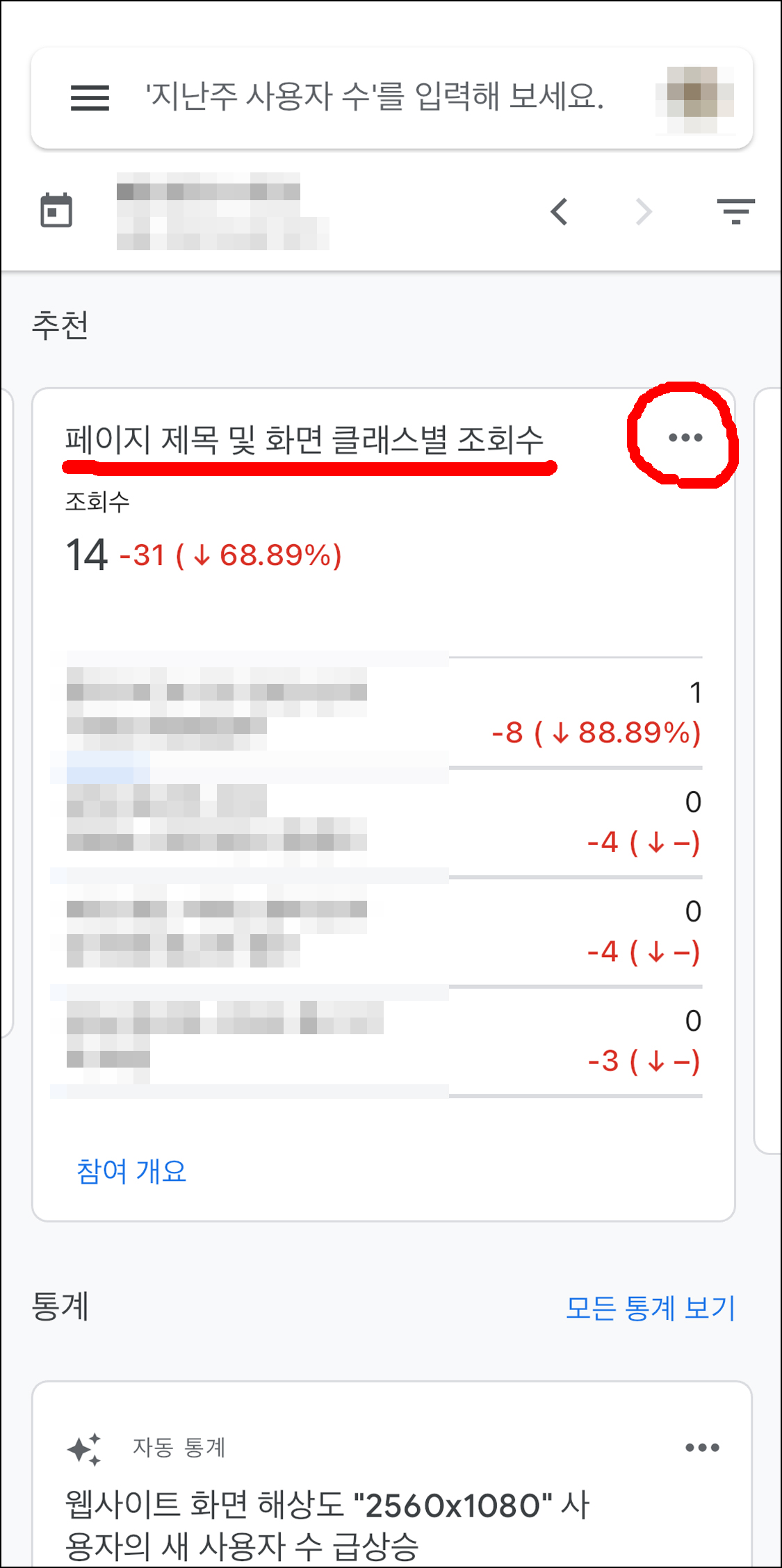 화면을 조금 아래로 내리면 추천이라는 항목이 있습니다. 그 항목을 스와이핑 해서 '페이지 제목 및 화면 클래스별 조회수' 항목으로 들어갑니다. 해당 화면 점 3개를 누르면 설정을 변경할 수 있습니다.