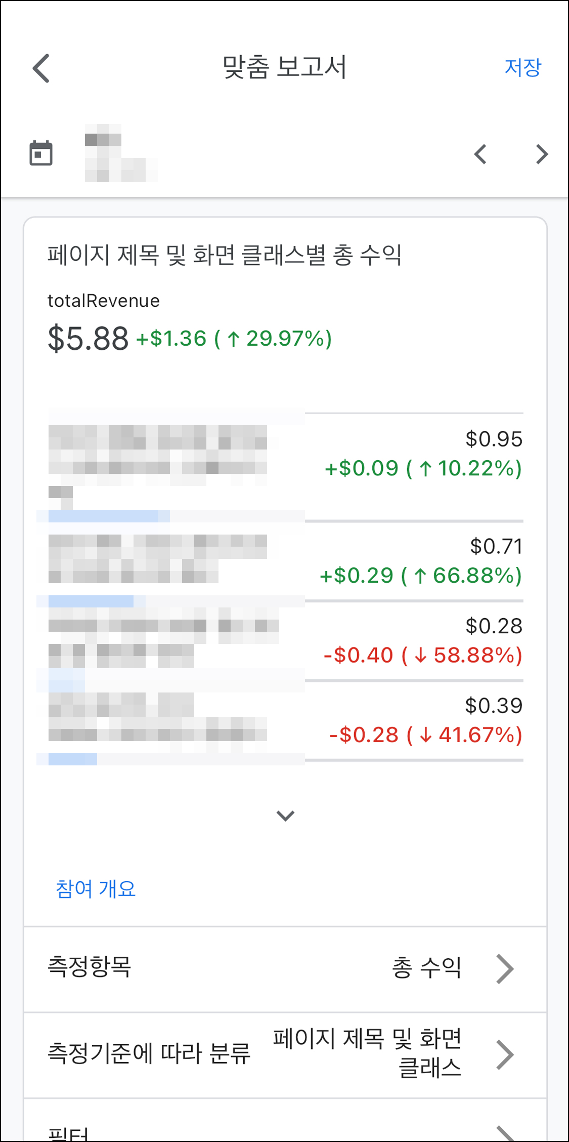 전자상거래 카테고리를 선택하면 여러 가지 옵션이 나옵니다. 여기서 '총수익'을 선택합니다. 그렇게만 하고 우측 상단에 저장을 누르면 이 설정값의 보고서가 생성됩니다. 이렇게 생선 된 보고서는 대시보드 화면에서 바로 확인할 수 있습니다. 일별, 주별, 월별로 어떤 글에서 수익이 발생되었는지 직관적으로 볼 수 있습니다.