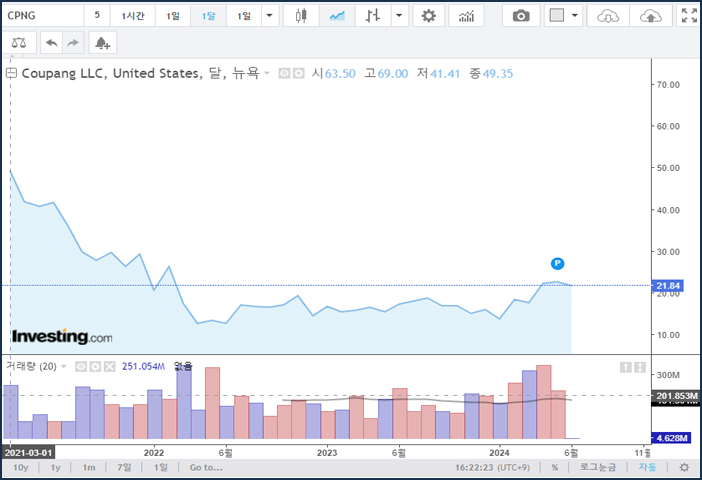 차트나 실적은 좋아하는 이유를 대기 위함인 거죠. 그럼 쿠팡은 어떨까요? 쿠팡은 공모가 35달러를 훌쩍 넘은 49달러에 첫날 신고가를 작성한 이후로 계속 하향세를 탔습니다.